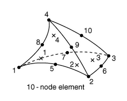 This calculation of strain from displacement involves differentiation. Common computers, in their current form, are either incapable or very inefficient in performing analytical differentiation, and thus, differentiation in software like Abaqus is “pre-coded” and calculated at integration points only. This implies that strain in an element is only available at the integration points which are located below the surface of C3D10 elements (see Figure 1). This strain is then combined with the material data provided by the user to compute the stress, again at the integration points.