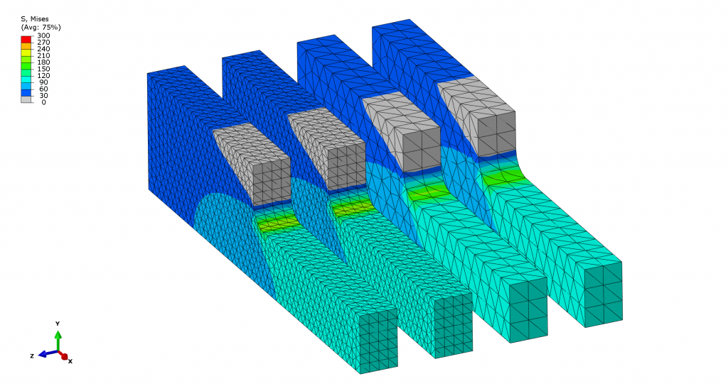 Figure 3: As the stress begins to exceed yield (300 MPa), faulty extrapolation (dark red) becomes apparent in the C3D10 elements. Download this model to test for yourself.