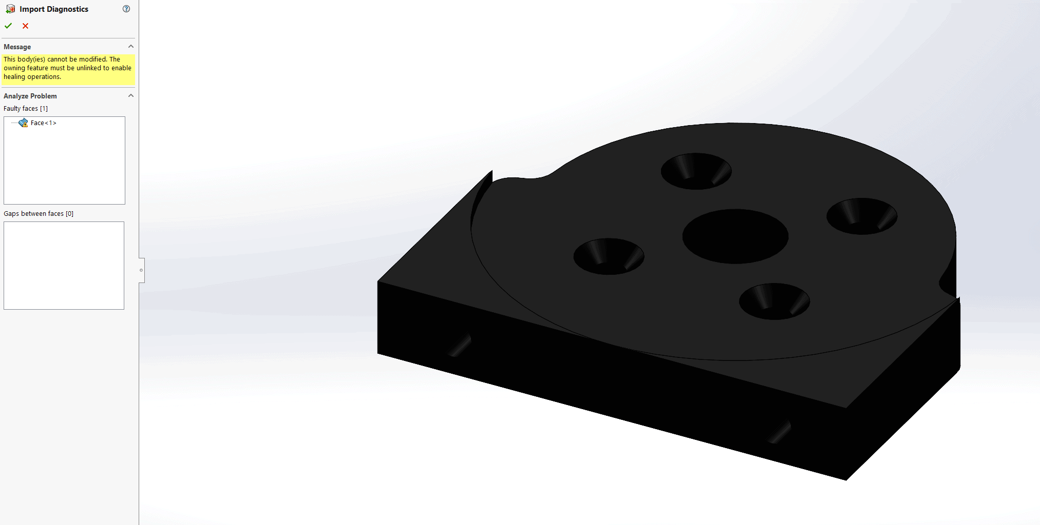 SOLIDWORKS will prompt us for the templates to use and you may run Import Diagnostics if you wish. To speak to the power of this combination, however, I will point out that this particular part has errors I will leave unresolved: