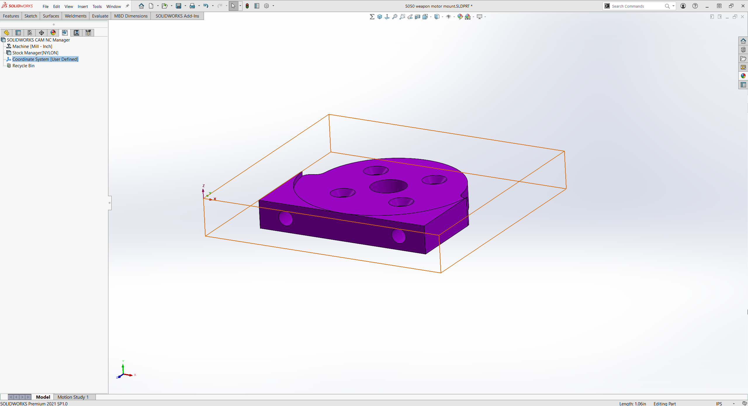 From here, I can simply proceed as I would with any standard SOLIDWORKS CAM setup – I will define my machine, post processor, stock, and coordinate system.