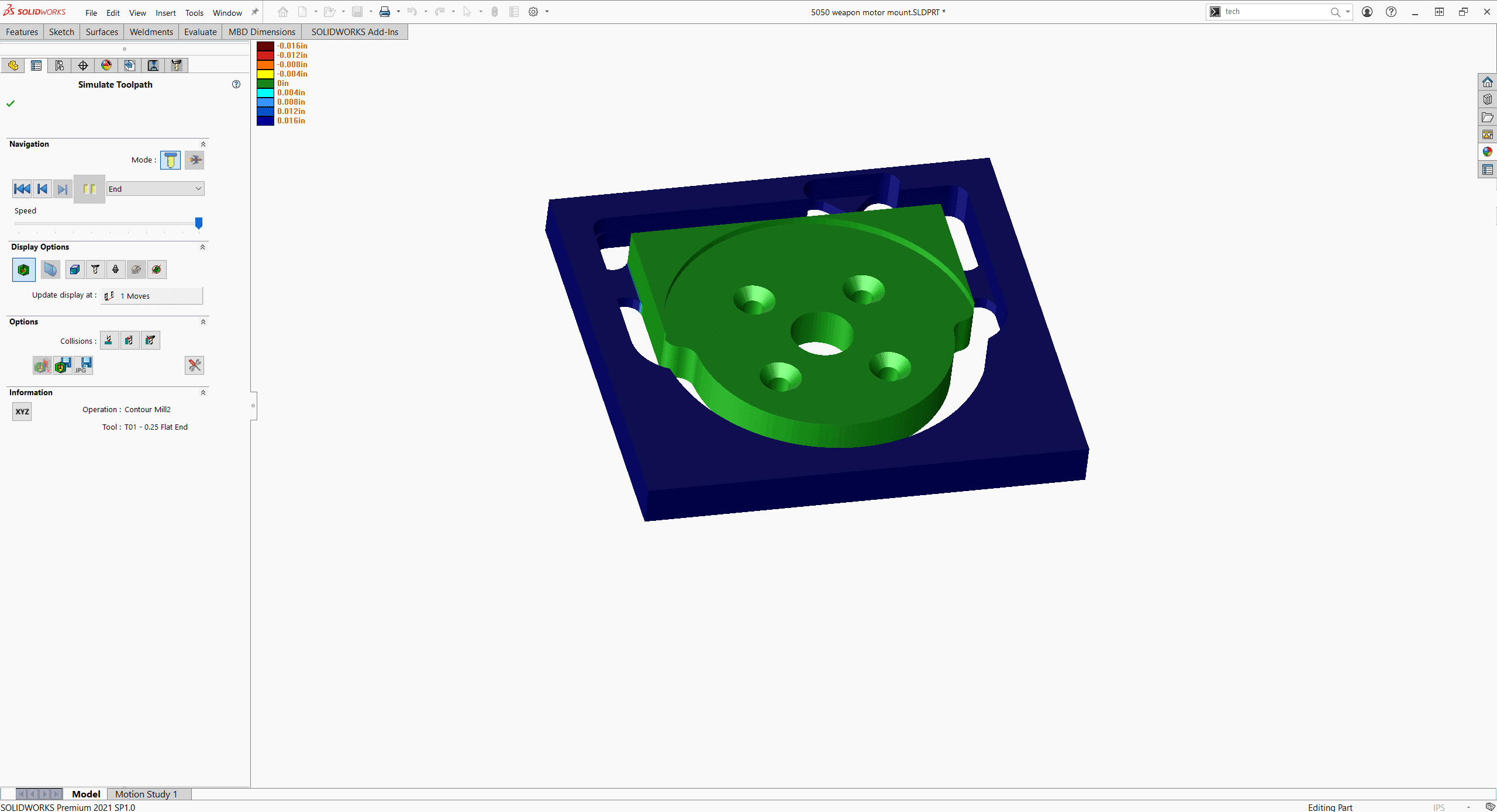 By selecting faces and adding 2.5D operations, however, we are able to quickly add a face, open pocket, and part perimeter features, and in under ten minutes we have gone from an Inventor part file to posting G-Code out of SOLIDWORKS CAM: