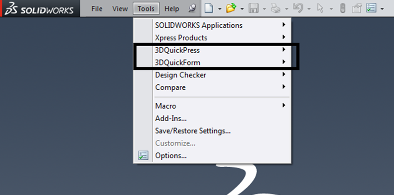 3. New in SOLIDWORKS 2015 - menus for Gold Partners like 3DQuickPress and 3DQuickForm will be moved to the Tools pull down tab as shown in the screen shot below.