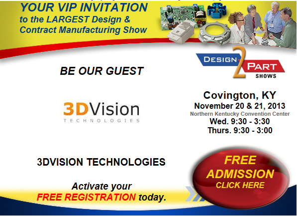 3DVision Technologies will be exhibiting at the largest design and contract manufacturing show in the region, the Design-2-Part Show, November 20th-21st at the Northern Kentucky Convention Center. From design ideas, to custom and stock parts, thru final assembly, you will find the instant answers you need at this show.