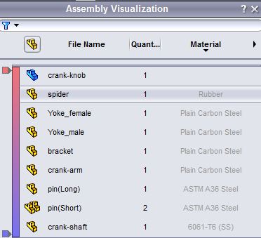 5. Now you can sort by this property by clicking on its heading and your parts with missing information will come to the top. You can quickly see I haven’t assigned a material to my “crank-knob”