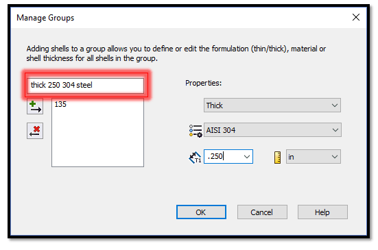 We may then select a name and choose some properties that we want associated with this group. This will then enable us to select bodies and define all of the properties simply by choosing which group it will belong to.