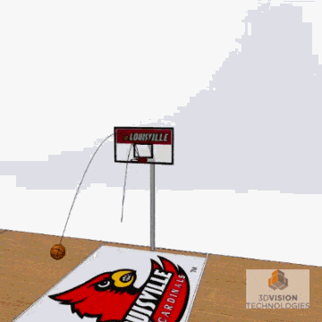 In SOLIDWORKS I have a basketball modeled to the size and weight specifications of a men’s collegiate basketball: maximum circumference of 30”, a weight of approximately 22 ounces, and seams no wider than ¼”. I also have half a basketball court modeled including the goal post, backboard and rim. I added the decals for my alma mater, The University of Louisville, and my favorite NCAA basketball team, the Louisville Cardinals!