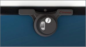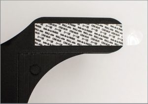 STEP 3:  Clean the bonding surface on the camera mount and printer, clean outer viewing glass on printer, remove adhesive strips from 3M Command strips or similar high strength mounting tape.  Insert camera into camera mount.  Attach camera to viewing window.  Align horizontal wings on camera mount to black window trim or center camera mount to center of Polyjet printer window glass just below window trim blackout.