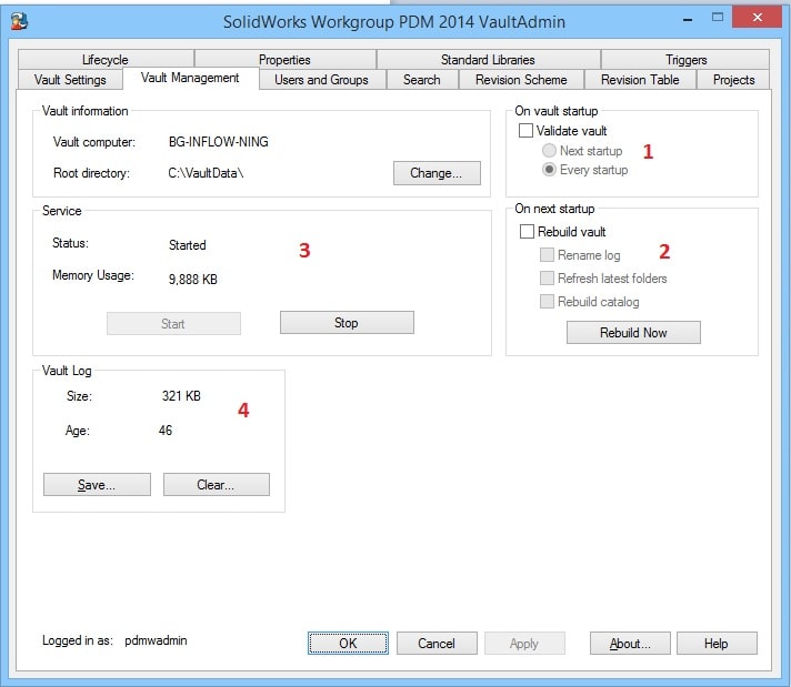 With SolidWorks Workgroup PDM 2014 comes a much easier way to management your vault server. A new tab "Vault Management" let users validate, rebuild and even reboot their server without having to remote into their server.