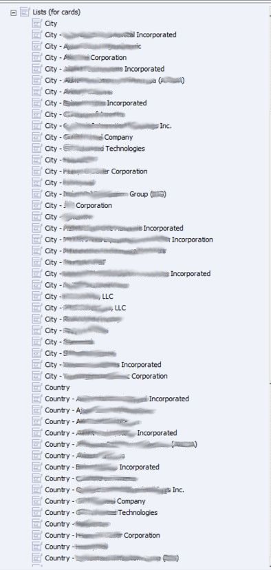 Today I was doing some consulting work for a SOLIDWORKS Enterprise PDM customer of another VAR. Look at this screen shot of the number of lists they were using for their data cards. Each of their customers have their own list of cities, countries, contacts…it’s very nice because their data cards are very accurate -great for searching!
