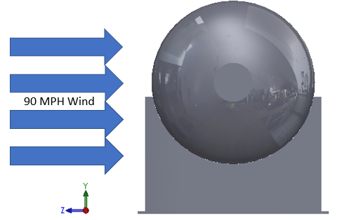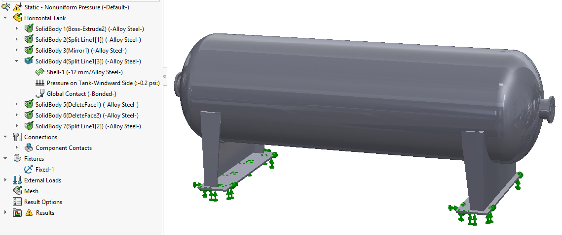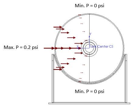Assume a maximum pressure value of 0.2 psi generated from the wind impacting the tank. Note: this value is the maximum pressure obtained from a calculation performed with SOLIDWORKS Flow Simulation. If you have access to this program, it is possible to simulate the wind environment and export the resulting surface pressures directly to the Simulation tool. Civil Engineering references can also help estimate pressure fields from wind loading.