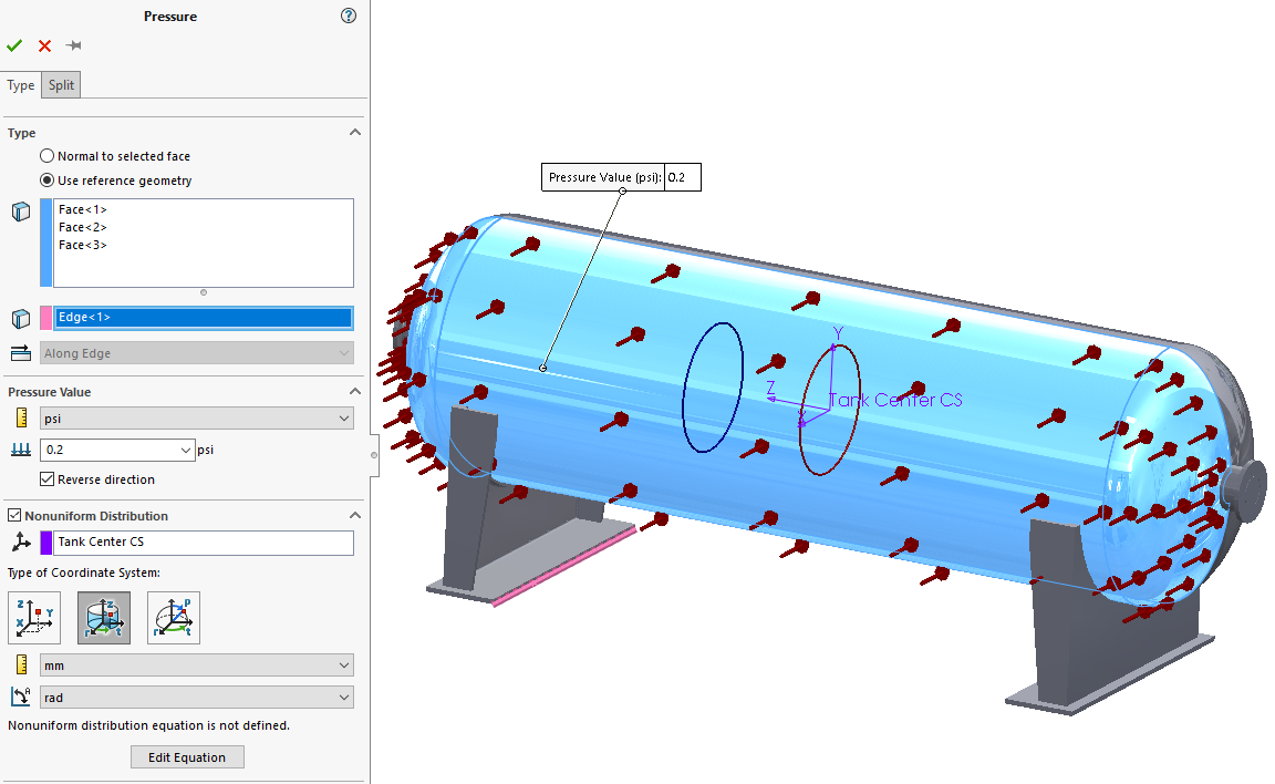 The pressure varies as the air moves around the tank, so we need to activate the nonuniform pressure distribution. This feature is available within both the force and pressure load property managers. The variation can be applied relative to a cartesian, cylindrical or spherical (CS).