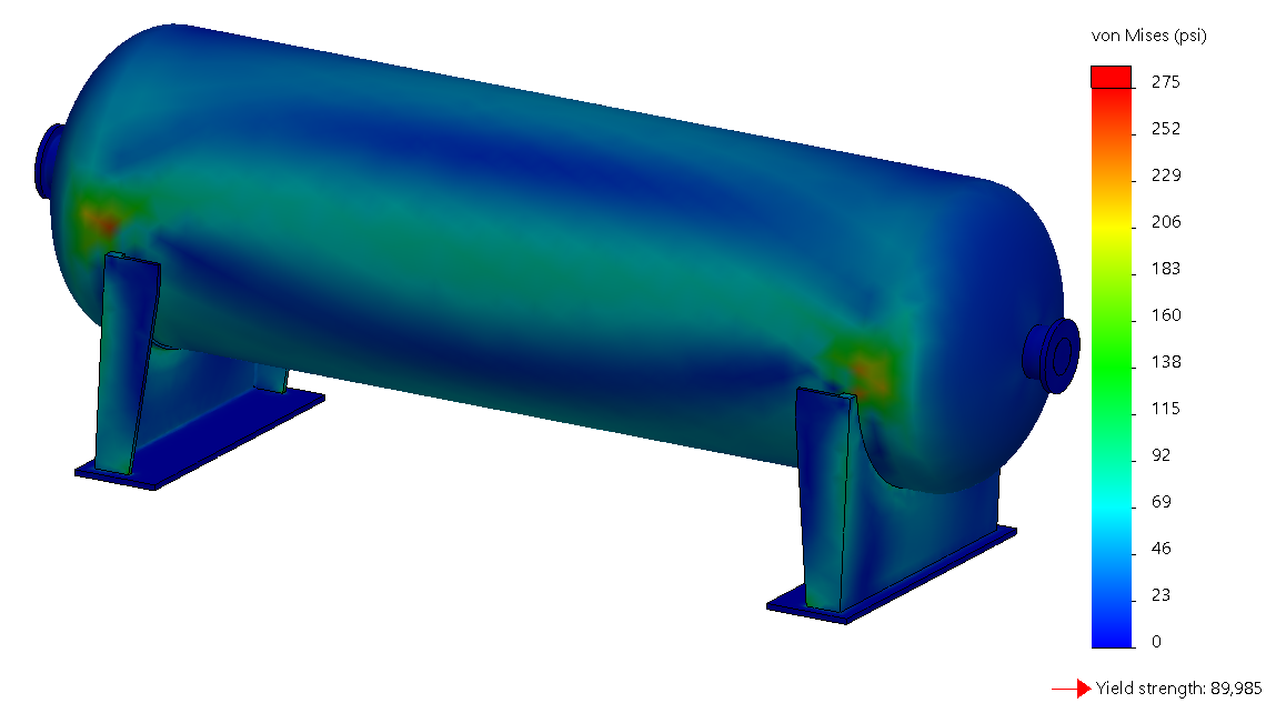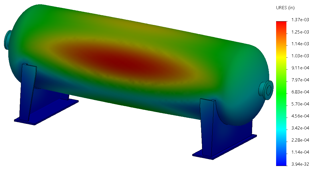 This extreme-weather load environment could be combined with other operational loads such as internal pressure, thermal expansion and reactions from attached pipe systems using the Pressure Vessel (PV) study available in Simulation Professional. The PV study can generate worst-case loading conditions and report specific stress values as required by certifying agencies such as the American Society of Mechanical Engineers (ASME) and American Petroleum Institute (API).