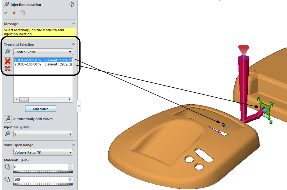 While in the Injection Location Property Manager, we switch to the new “Control Valve” settings and add the locations manually, or let SOLIDWORKS Plastics automatically find them based on where the runner system meets the molded part.
