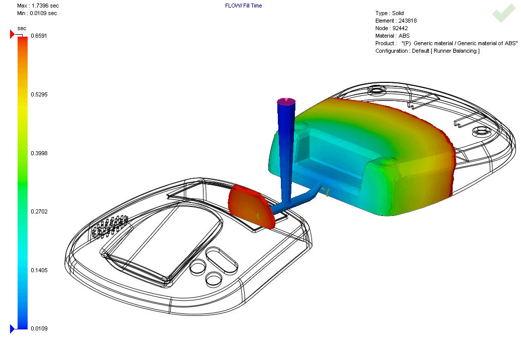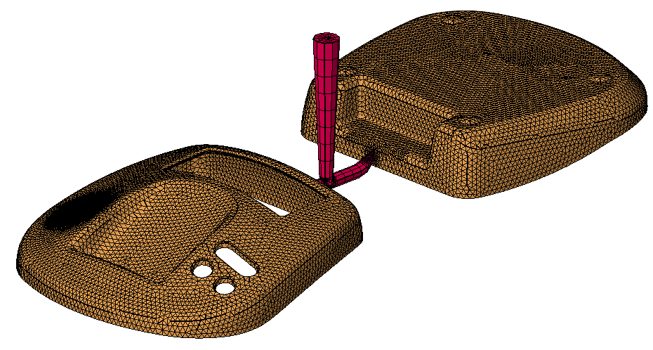 Control valve setup is shown in the following example. In this “family mold” injection simulation, the part and hot runner system are meshed.