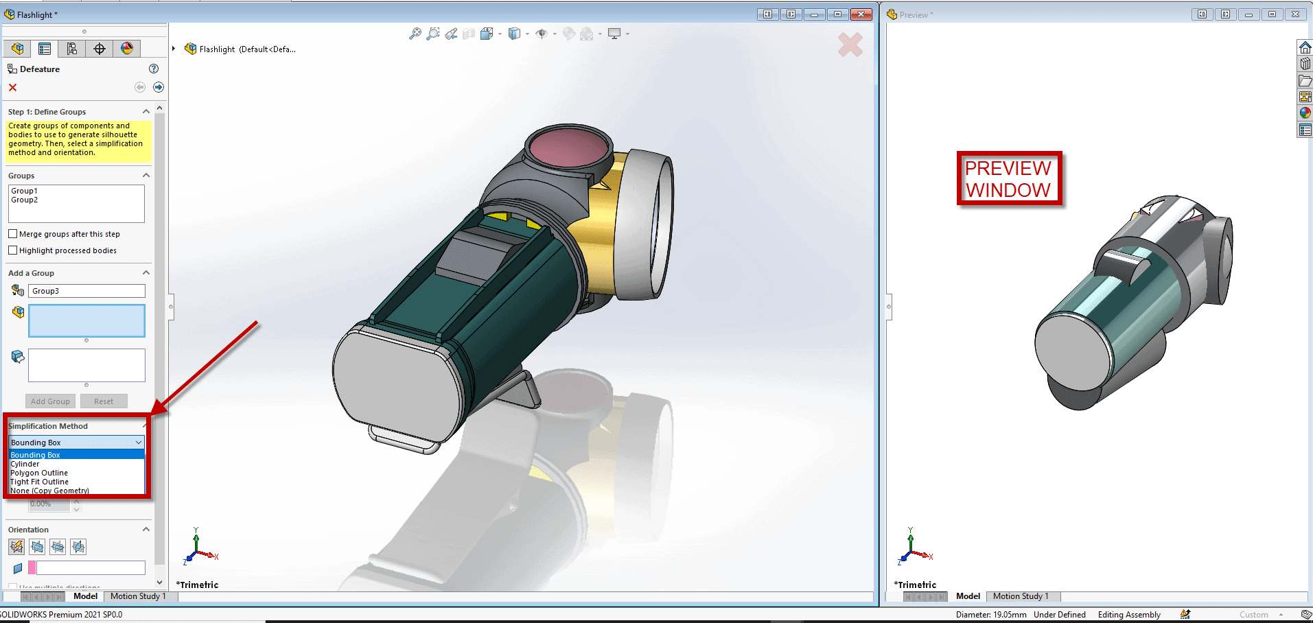 Group parts and subassemblies and decide how you want them to be defeatured. Parts and subassemblies can be represented by: bounding box, cylinder, polygons, or tighter fit polygons.