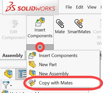 The Copy With Mates command can be found on the drop-down under the Insert Component command, or of course, found by simply searching in the upper right corner of the SW screen.