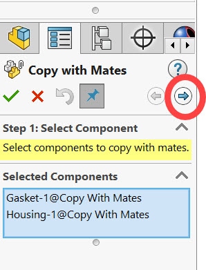 The first step is to select the part or parts you want to copy. Then hit the “next” button on the command manager.