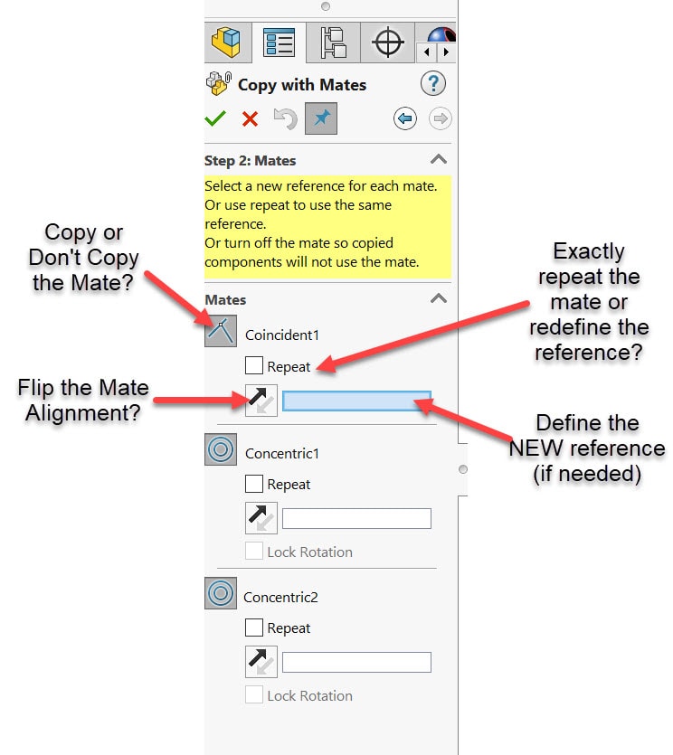 Now you use the command manager to set whether you want each individual mate to literally refer to the exact same reference it did in the original mating situation or if you need to re-define the reference to something else. You can also “turn off” some of the mates!