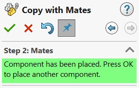 Then it’s just a matter of satisfying the new references for the mates as necessary. When you hit “select the last reference” the parts will be copied, and the new mates will be applied. The really cool thing is it will also ask you if you want to Copy With Mates AGAIN by just hitting OK. If you do it’s even faster the 2nd (or 23rd) time around!