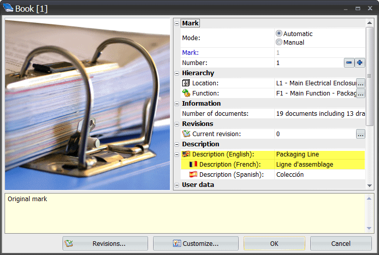 When the primary language is set, if data exists for the French language in the meta-data, the software will change how the descriptions are displayed. In Figure 3 and Figure 4, we can see that descriptive properties of document books, schematic sheets, reports, and folders are immediately modified to French. The location of the descriptive properties are embedded in the properties of each document:
