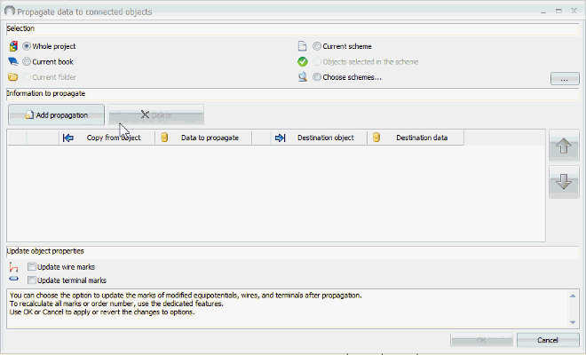 Once the resulting window opens you will need to add a new propagation rule. After the rule is added, pick the origin and destination attributes you’d like to copy or replace. If you are propagating to equipotential, wires, or terminals, then make sure the “Update wire marks” checkbox in the bottom of the propagation window is checked. This will update the marks after propagation. Refer to the GIF below for a visual representation of this process.