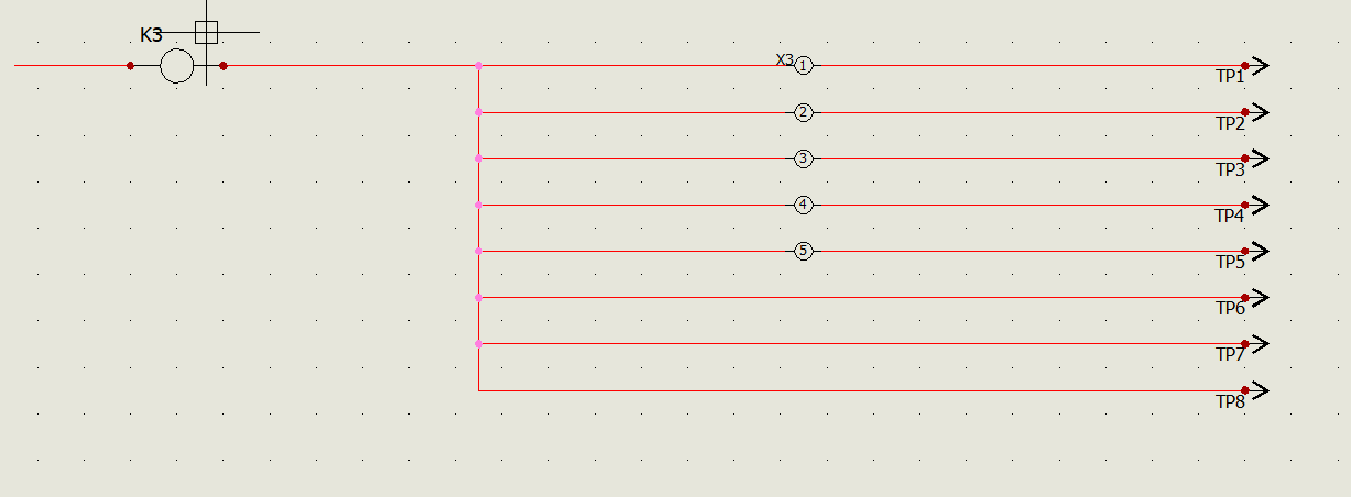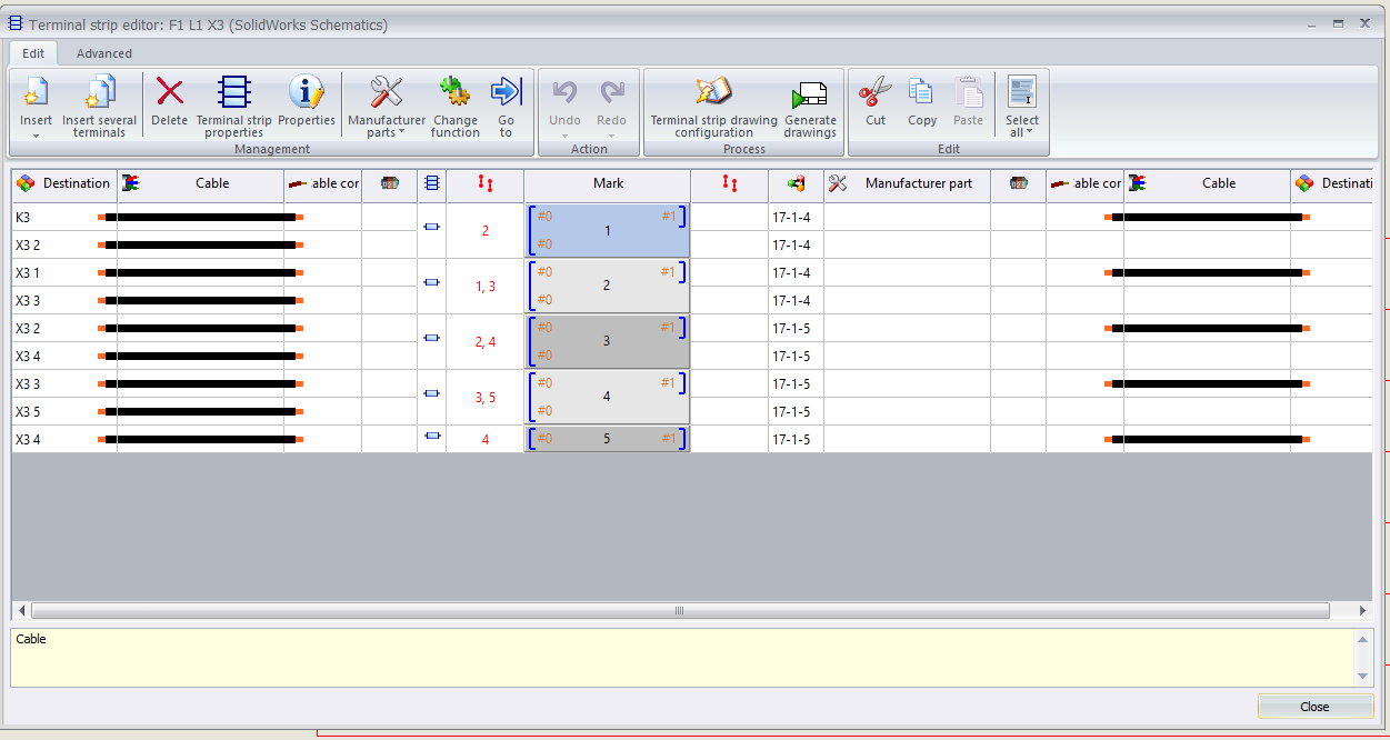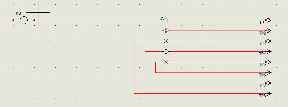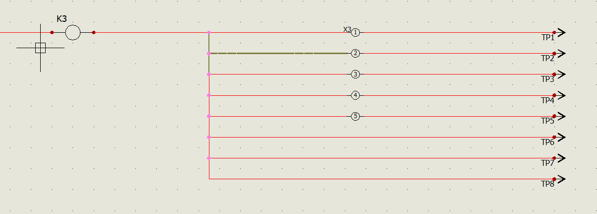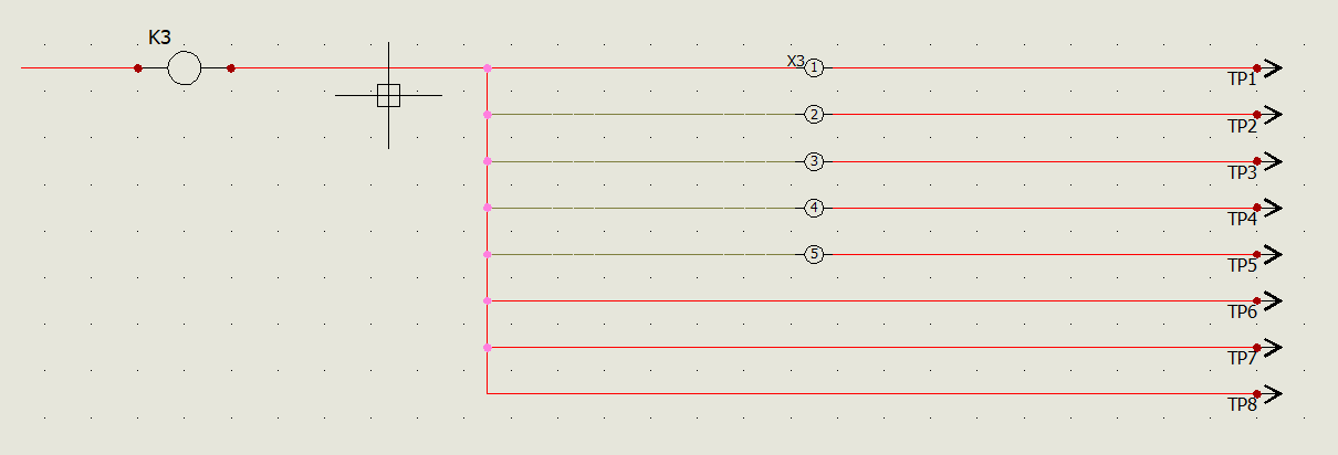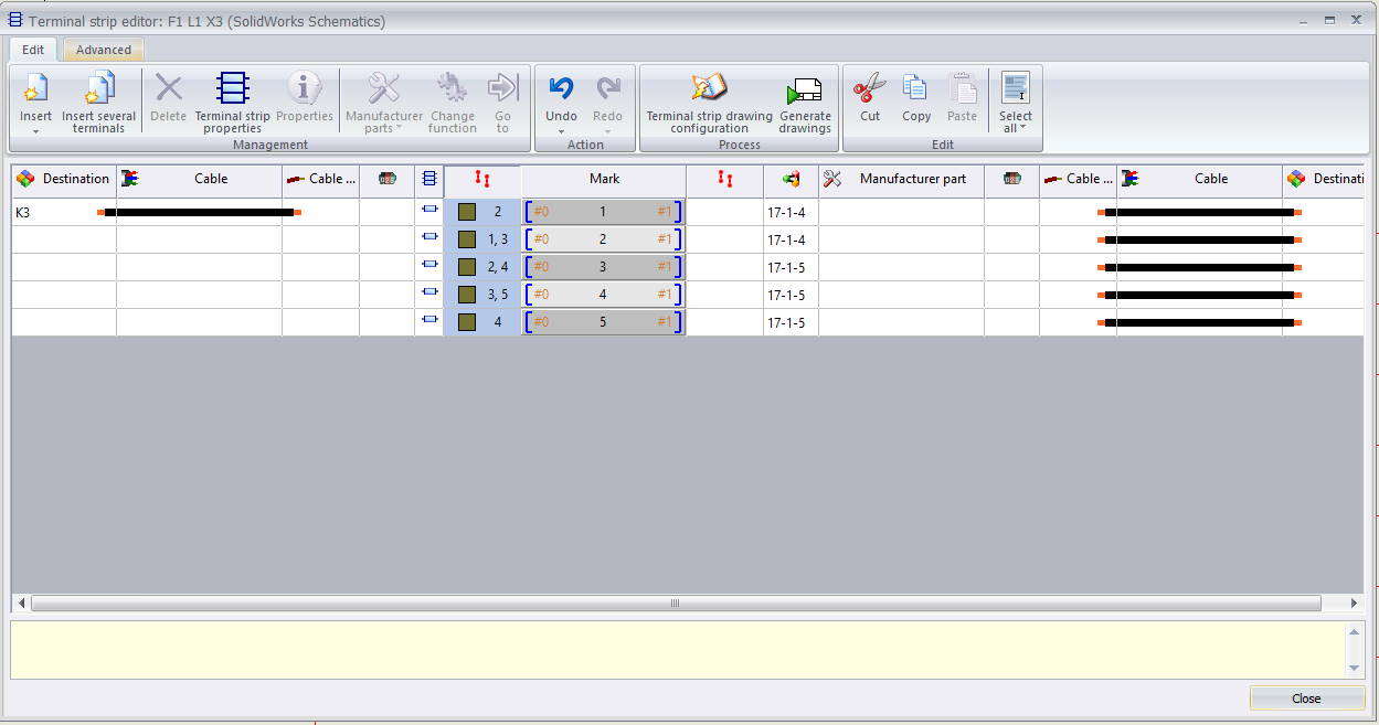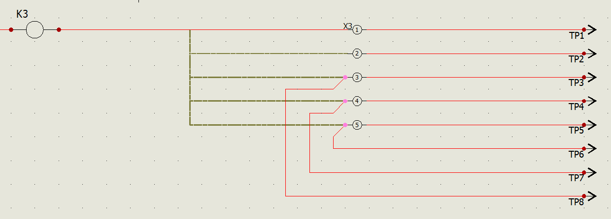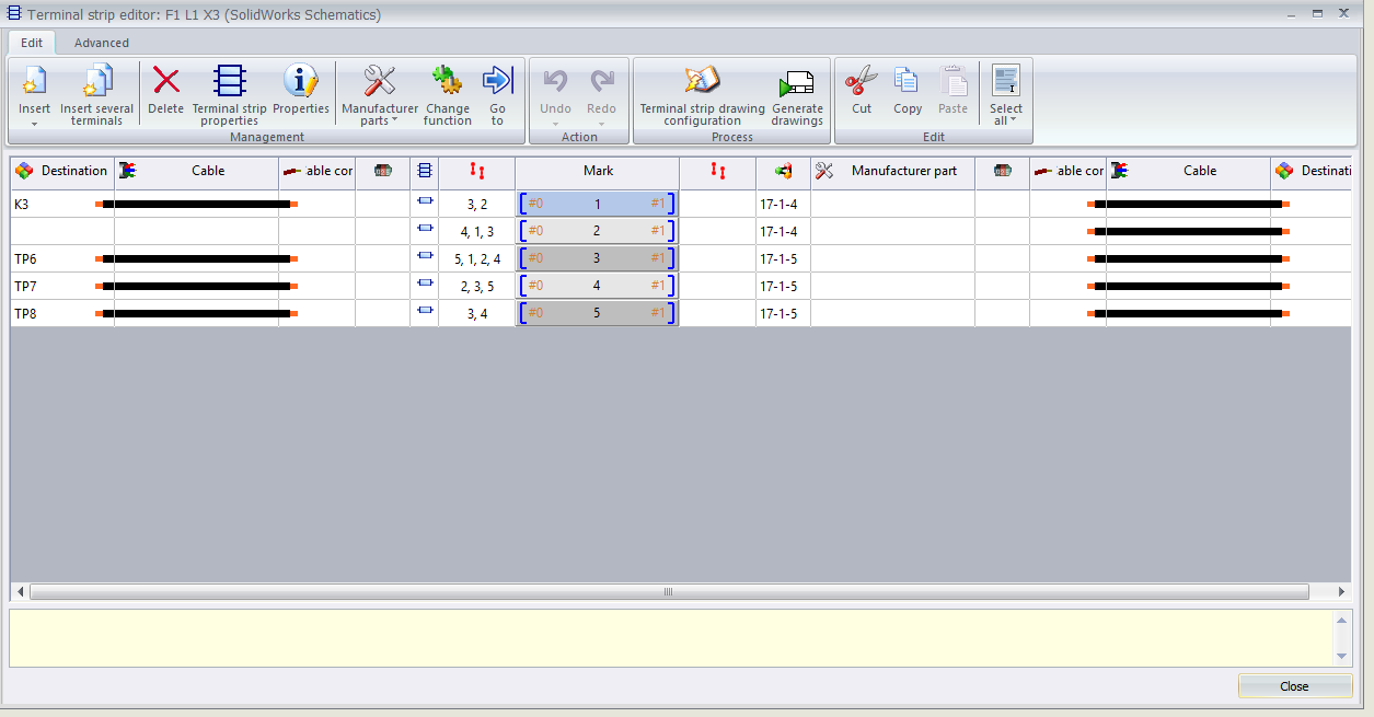At this point I know SOLIDWORKS sees the wires going to TP 6,7,8 as attached to K3. This is because the lines on 3-5 are gold (representing terminal bridges). In addition, the terminal editor shows just one wire on terminal 3 connecting to K3. But what if I want to modify those connections so they go to terminals 3, 4, and 5?