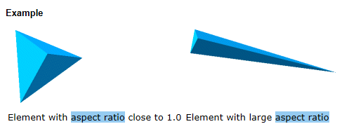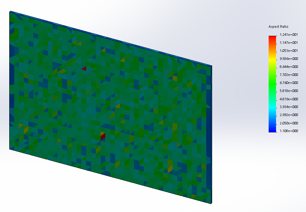 • Aspect Ratio: Aspect Ratio is a good measure of element quality. The perfect tetrahedron has an Aspect Ratio of 1.0, and the larger the aspect ratio, the less ideal the element. Typically, a very small percentage of elements with an Aspect Ratio>10 is desired.SOLIDWORKS Simulation