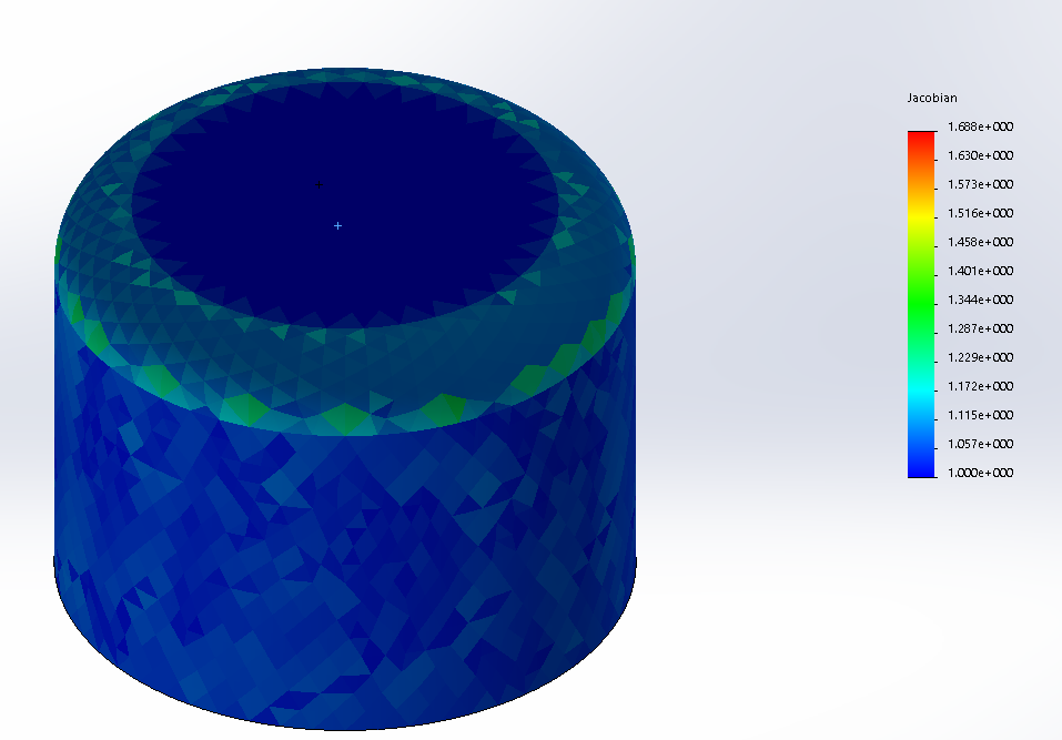 • Jacobian: Only available for high quality (2nd order) elements. These types of elements are much more adept at capturing curved geometry, but small areas of high curvature can pose problems. A perfect Jacobian element has all mid-side nodes located exactly at the middle of straight edges. The Jacobian ratio is a complex subject. Essentially, the ratio increases as curvature of the edges increase. Jacobian Ratios of 40 or less are acceptable.