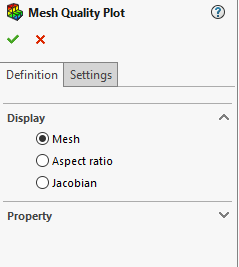• Mesh Quality Plot: Once a mesh is created in SOLIDWORKS Simulation, you can define a mesh quality plot (right Click the mesh-> create mesh quality plot). There are a few types of plots to choose from: