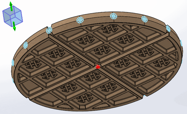 With the study created, I then focused on the appropriate boundary conditions for the analysis.  The injection location is on the bottom of the waffle in the center where each of the four quadrants come together.  The split lines on the outer edges of the waffle at the parting line generate vertices where I assigned vent locations for the SOLIDWORKS Plastics analysis.  Here, I highly recommend adding adequate venting along the parting line of the mold to induce a little bit of part flash.   Why, you ask?  The overcooked pieces of waffle are like thin, crispy breakfast cookies, according to my daughters. The clamp force direction should be obvious!