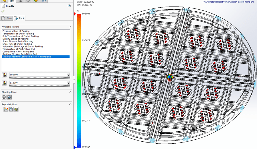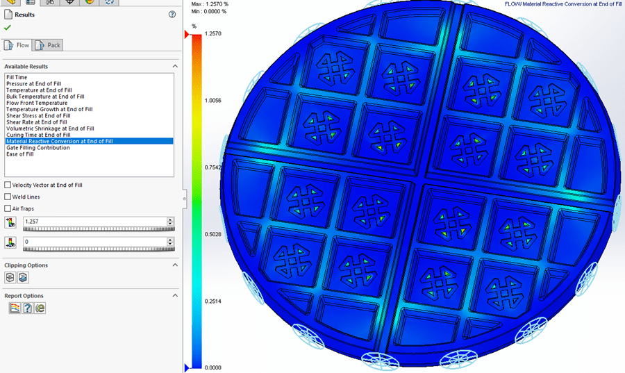 With the setup complete, I solved both the FILL and PACK stages of the analysis.  When working with a thermoset plastic analysis, there are a couple additional outputs from SOLIDWORKS Plastics that should be reviewed.  The first result plot is Material Reactive Conversion at End of Fill on the Flow results tab.  This plot tells me how much of the waffle has cooked when the FILL stage of prepared waffle batter has completed.  I want this to be as low as possible!  If too much of the batter cooks prior to filling the entire mold, the result can be a short shot.