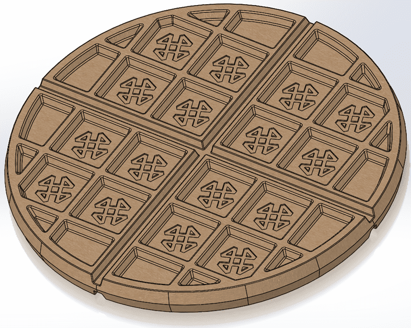 If you’re not yet convinced that the waffle iron re-design is needed, I’ll continue to plead my case using SOLIDWORKS Plastics Professional, by analyzing the rest of the waffle making process.  I created a SOLIDWORKS CAD model of a 7.5” diameter waffle, the approximate size of the single-cavity waffle maker discussed earlier.  For an upcharge, you can customize the waffle iron grids with corporate logos, as I have done with my waffle!