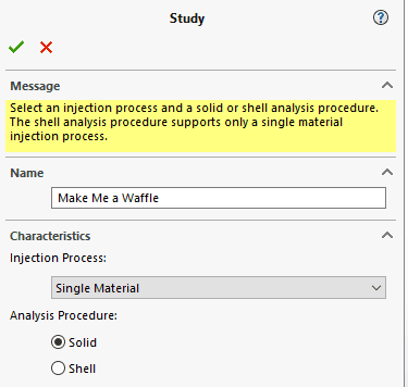I began a new SOLIDWORKS Plastics study using a Single Material Injection Process, a Solid Analysis Procedure, and gave the study a name.