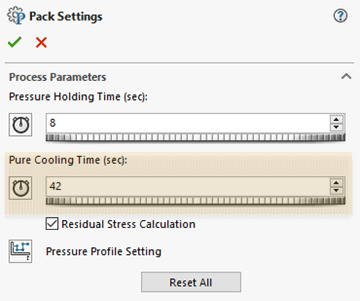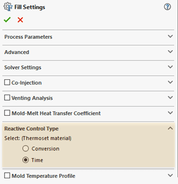 After creating the mesh, I assigned the material ‘custom waffle batter’ to the SOLIDWORKS Plastics project.  I’m assuming the waffle batter will act like a thermoset plastic, so the analysis requires both the FILL and PACK stages of the molding process.  For the FILL settings, I can modify the Process Parameters, such as Fill Time or Mold Temperature, though I chose to keep the default settings.  When working with a Thermoset material, I need to pay attention to the FILL setting for Reactive Control Type.   For cooking the waffle, I know how long the process should take, so I changed this from Conversion to Time. Reference SOLIDWORKS Knowledge Base Article S-064107 for a description of the two settings.