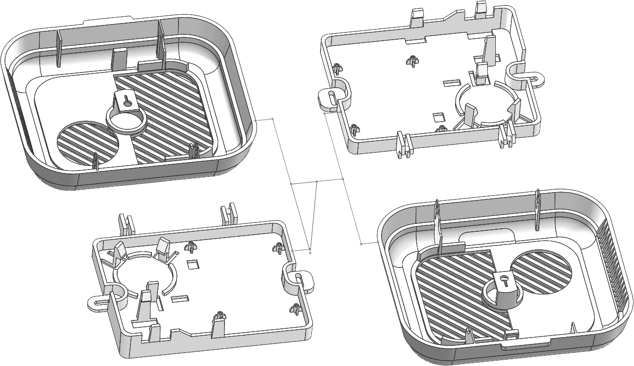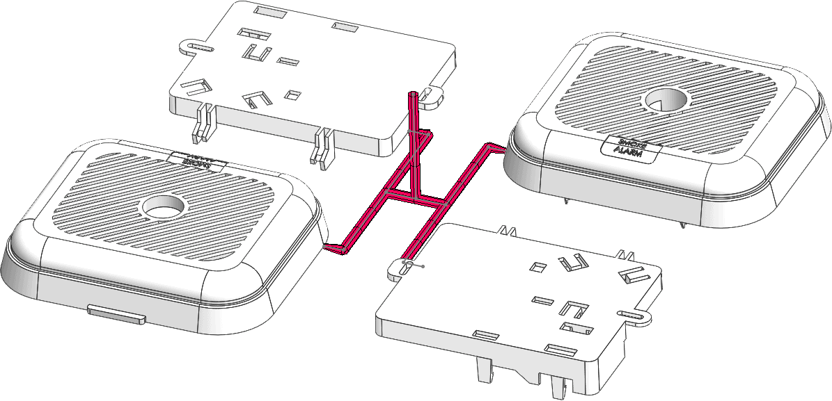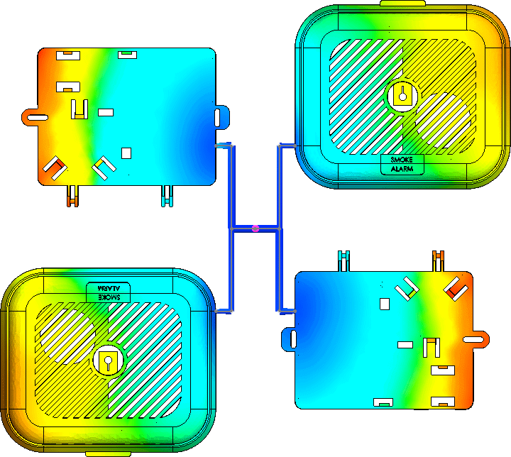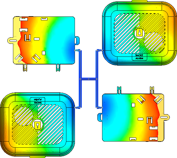 The test component is a smoke alarm body consisting of the top and bottom casing. The top and bottom are different volumetric sizes and varying wall thicknesses. The runner system can be modeled or virtually applied. In this case study I used the virtual runners. These are applied based on size inputs the user specifies. A 2D or 3D sketch is used to apply the runner system too.