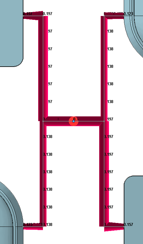 The optimized runner balancing is tuned on in the “Runner Balancing” option in the plastics tree. The user specifies the range of sizes for the runners and interpolates until the cavities fill evenly. The revised size distribution is shown below and the balanced output.