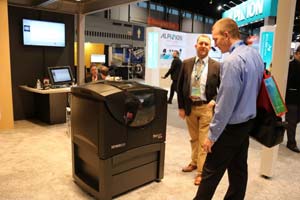 Stratasys Applications Engineer, David Dahl, fields questions about the Objet260 Connex3 3D Printer at the Vital Images booth.