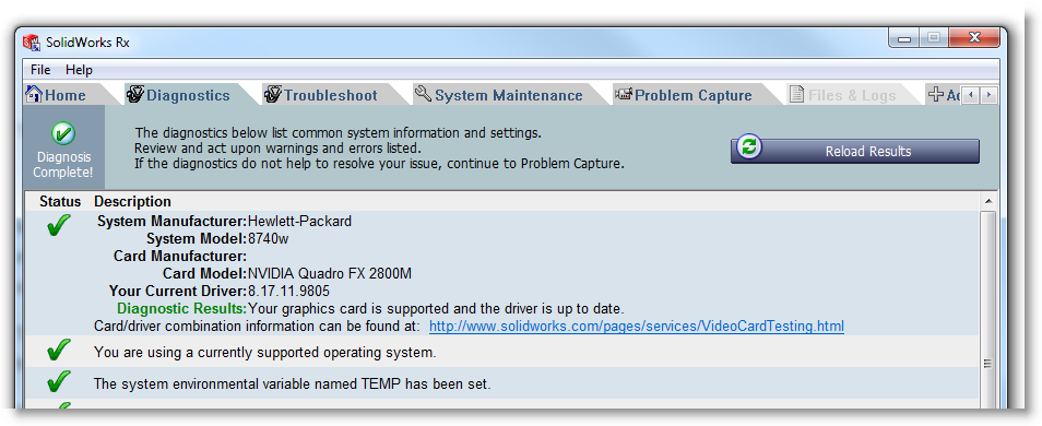 If for some reason you do not have a green check mark then you mostly likely need to update to the latest graphics card driver. If you do need to update simply follow the link provided by the SOLIDWORKS RX tool or check the SOLIDWORKS website at https://www.solidworks.com/sw/support/videocardtesting.html