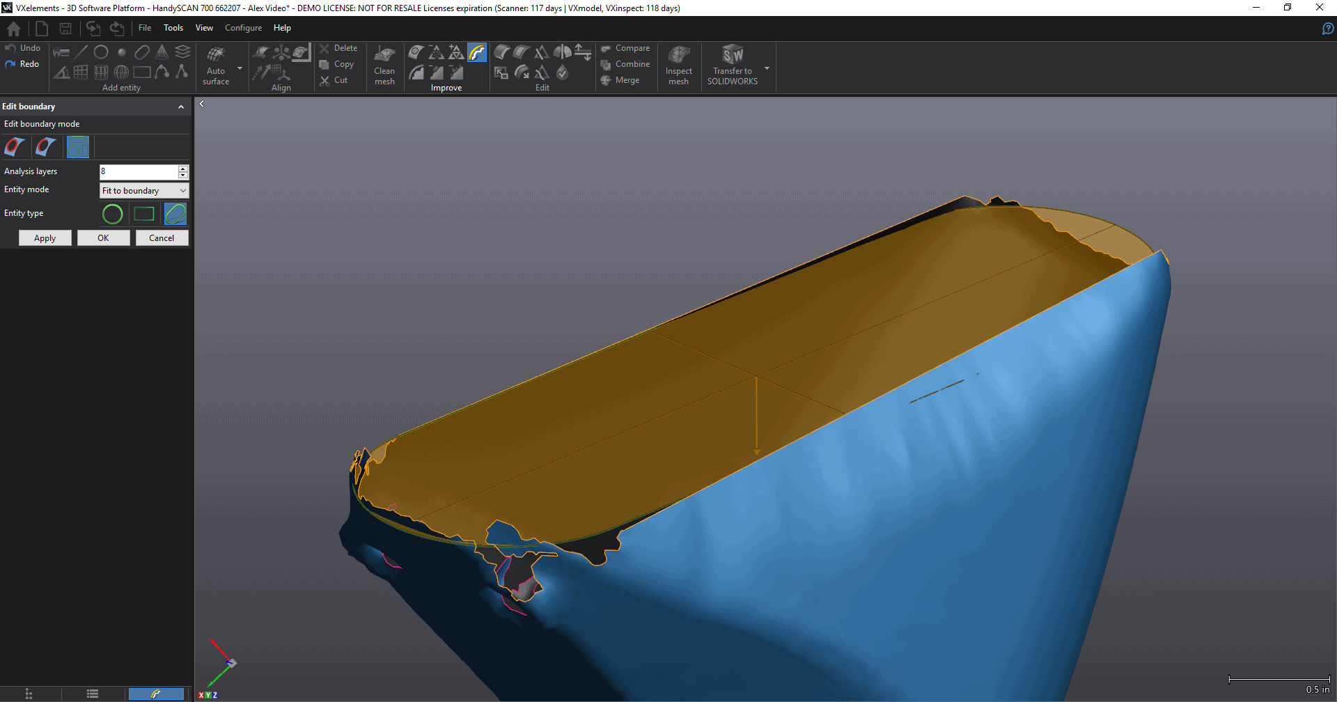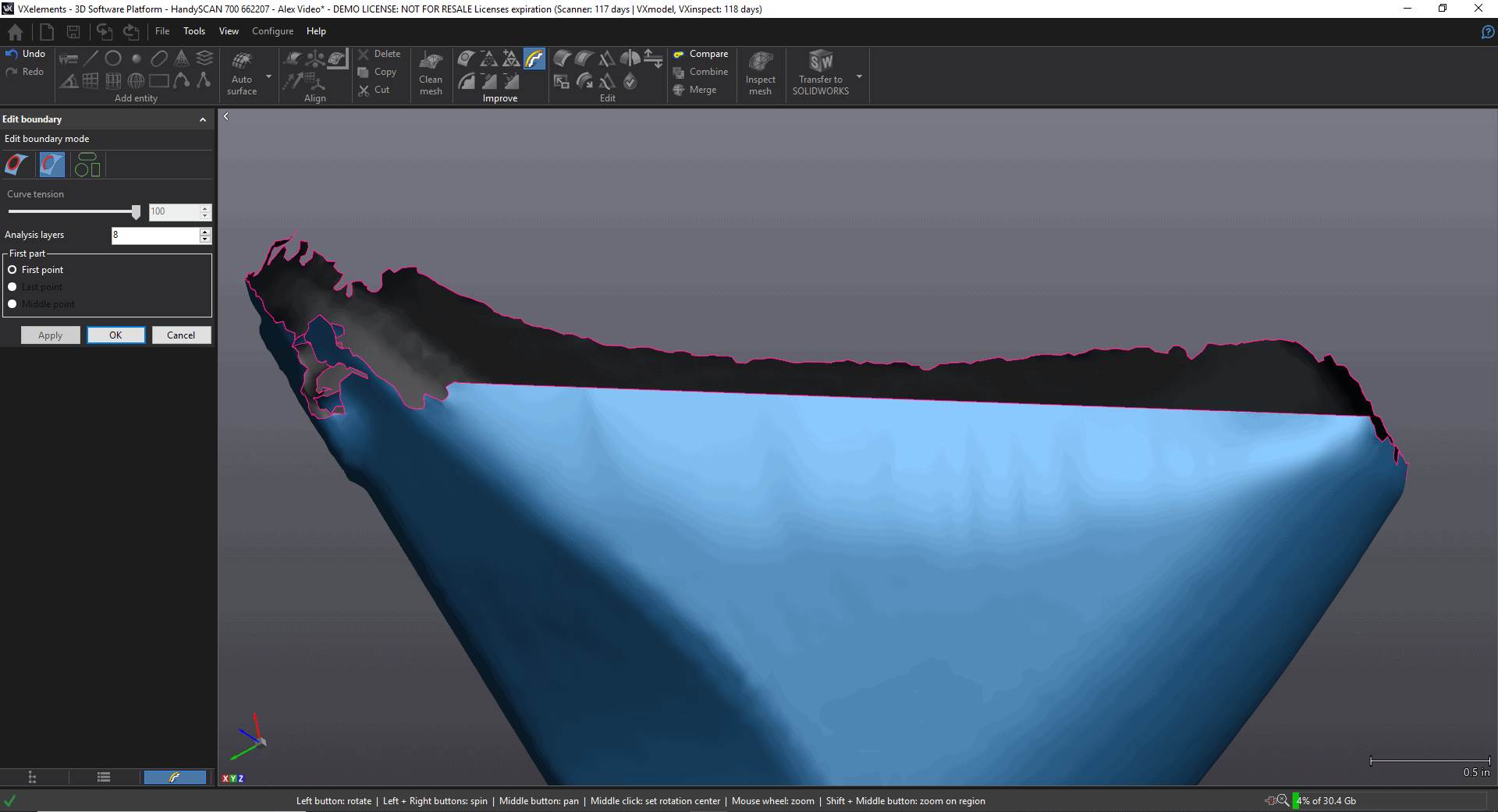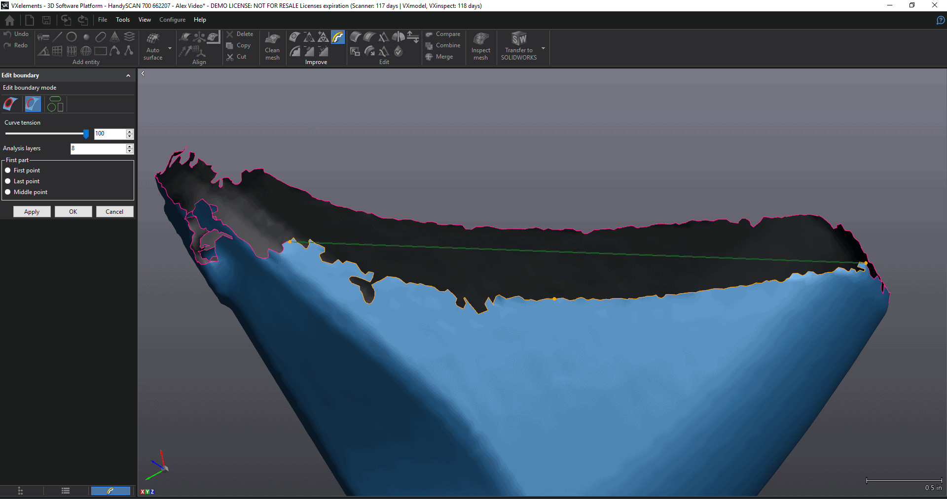 Let’s say I want the big hole just to be a flat surface. If I just tried to do a normal flat fill hole command, it won’t work. There are just too many irregularities for VX Model to compute a good result. What I’ll do is use the partial boundary edit tool and set my tension to 100 to straighten out the long edges on both sides.