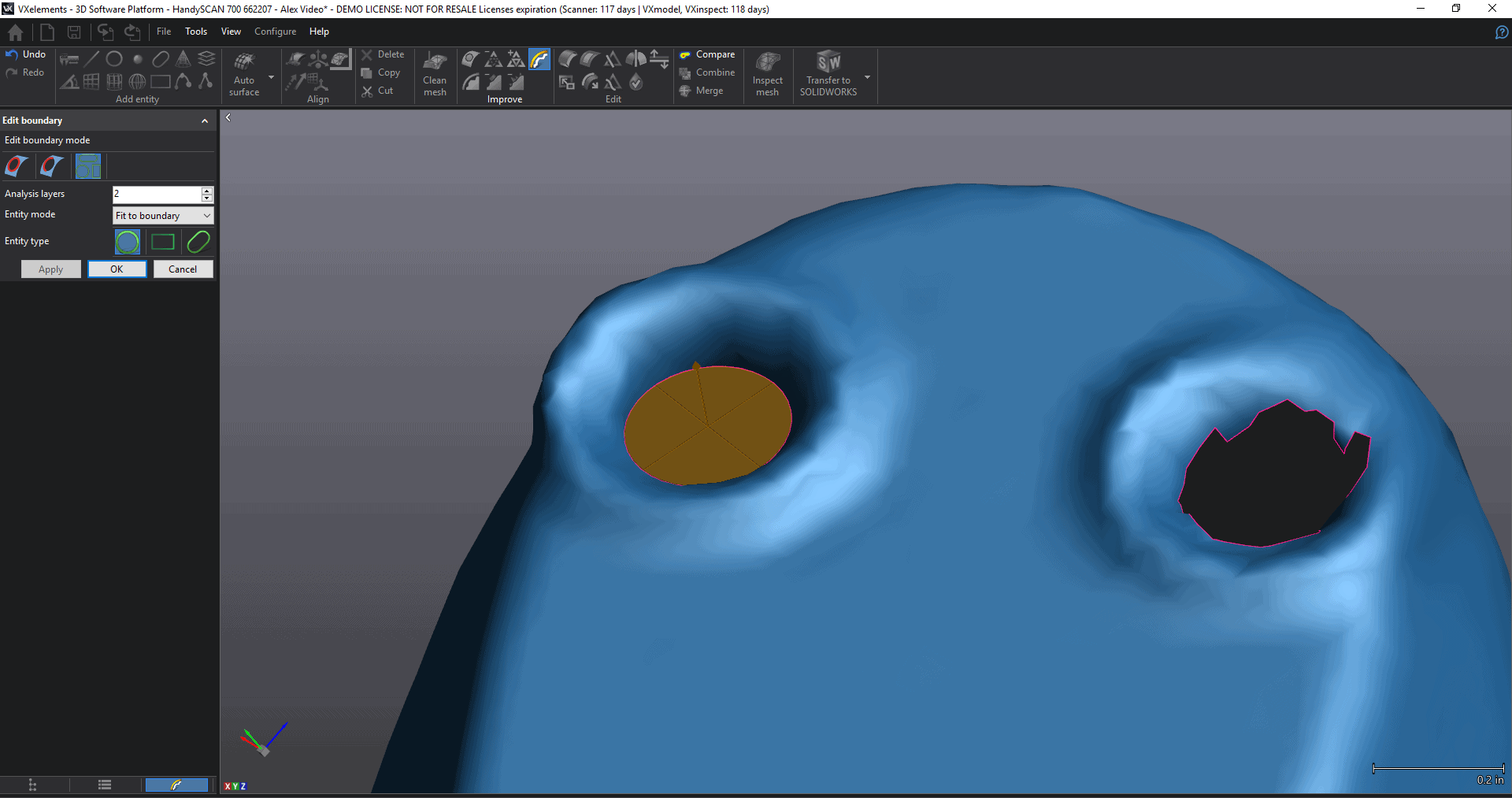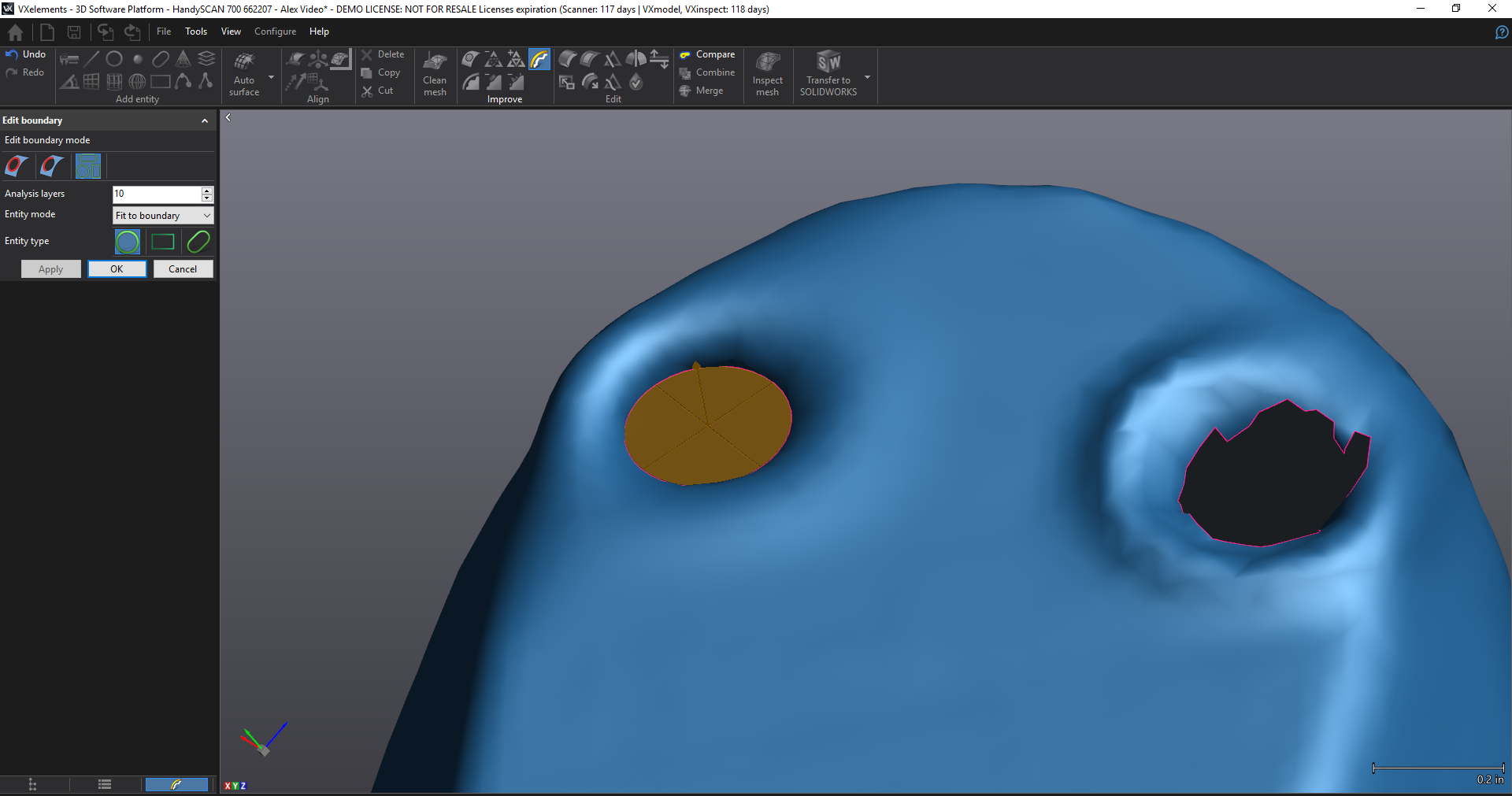 Now you can do a similar process as before. Use the fit to entity edit boundary tool, to make nice circular boundaries. Then fill them with a flat fill hole command. Adjusting the analysis layers or smoothing setting can be used to create either smoother or more natural holes.