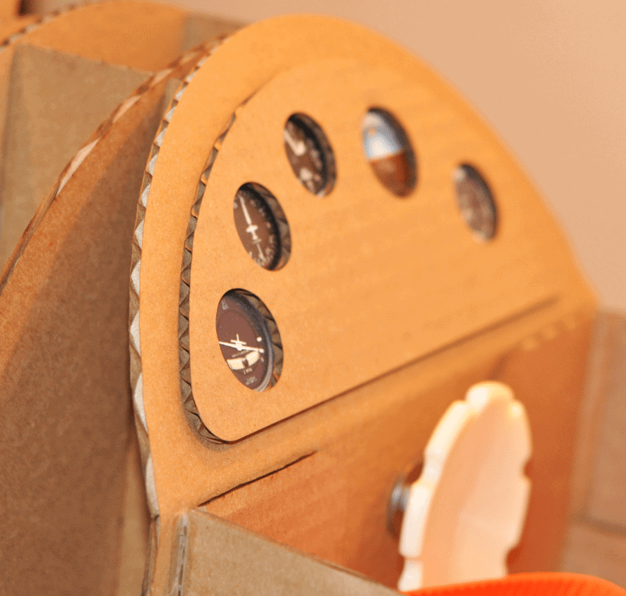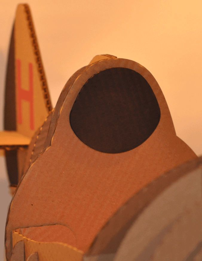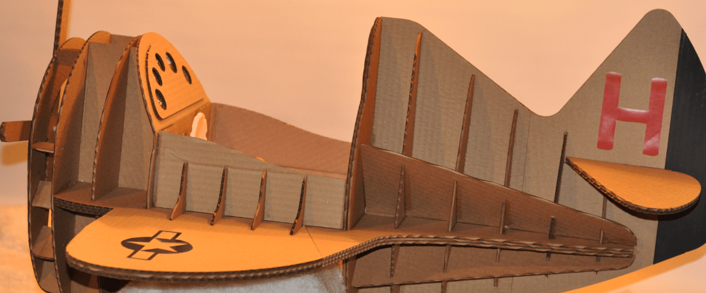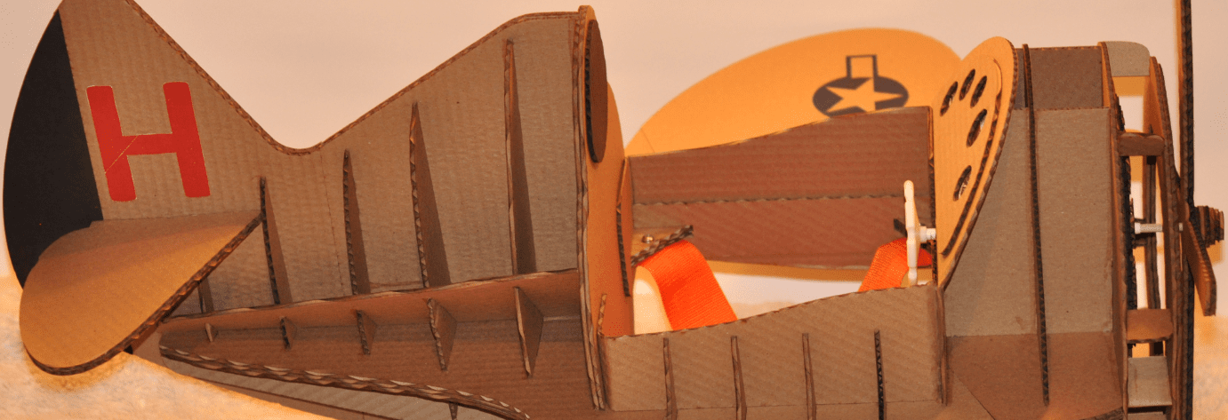 I decided to do a “cartoon scale” version of the plane keeping it to around a 36” wingspan, and 33” long. The main goal is to have a costume that has all the features of the real plane but is sized for Henry. The costume has to be light in weight and encourage mobility. I decided to use cardboard for the material and chose 3/16” thick sheets commercially available through most office stores.