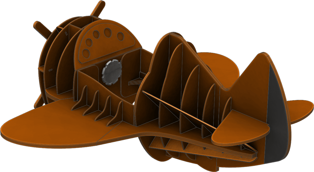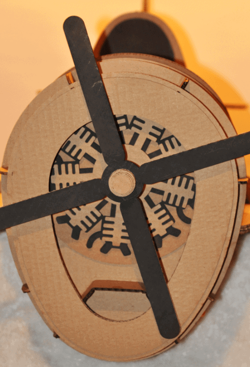 In an attempt to keep the lines of the original aircraft, the elevator was inserted via a slot in the tail and then covered by outer layers, leaving no open slot. A must-have feature of the costume is a spinning propeller. To do this I used a ¼” wood dowel to connect the propeller to a 3D printed propeller handle that resides inside the cockpit.