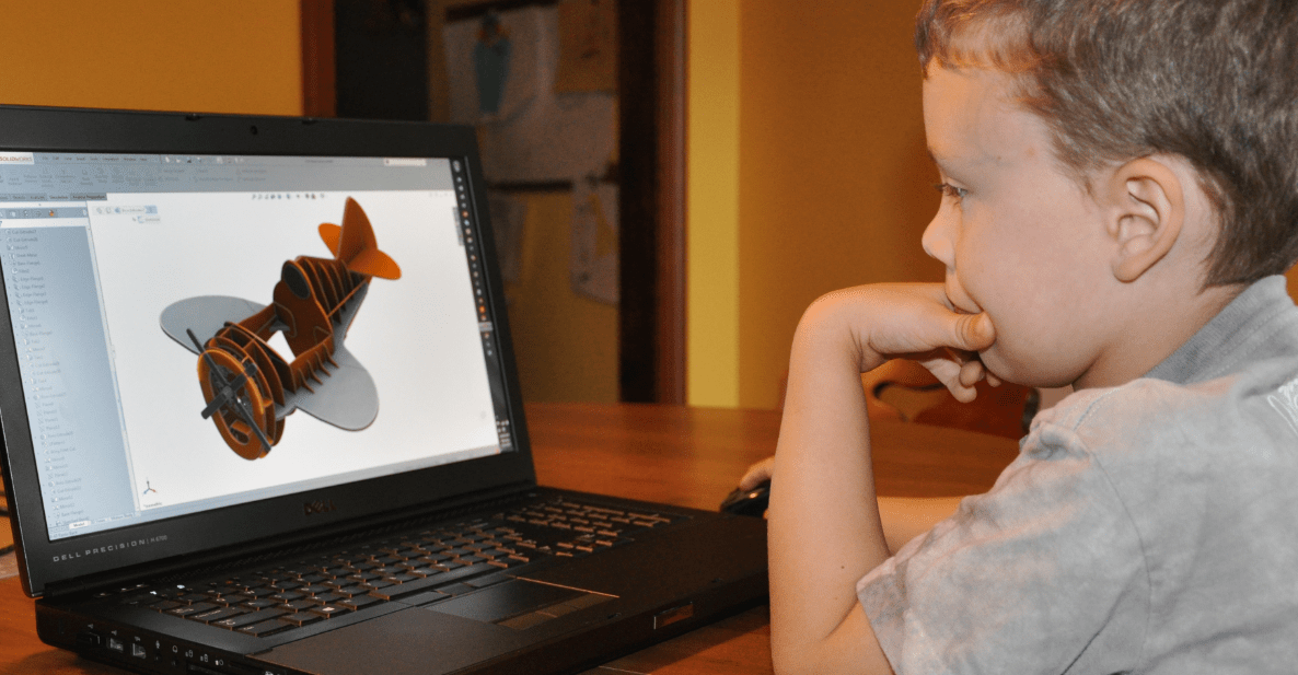 Chmura Custom Woodworks, local company to 3DVision/Cleveland came to the rescue. I contacted Bryan Chmura regarding the use of his laser table. I initially sent Bryan a 3d view of the project. Bryan was excited about the design and asked me to send the DXF. Within a couple of hours he provided a very reasonable quote for the job. The following week I dropped of the cardboard sheets for Chmura Custom Woodworks to cut the parts. Bryan did one thing that I forgot to do – he checked the sheet thickness. This was a crucial detail that I expected to be the true 3/16” dimension. In reality the sheets had been compressed from shipping and handling to a nominal 0.15”. This meant that my slots were too large and my part thickness was incorrect. I quickly modified the airplane design in SOLIDWORKS to change the sizes accordingly .