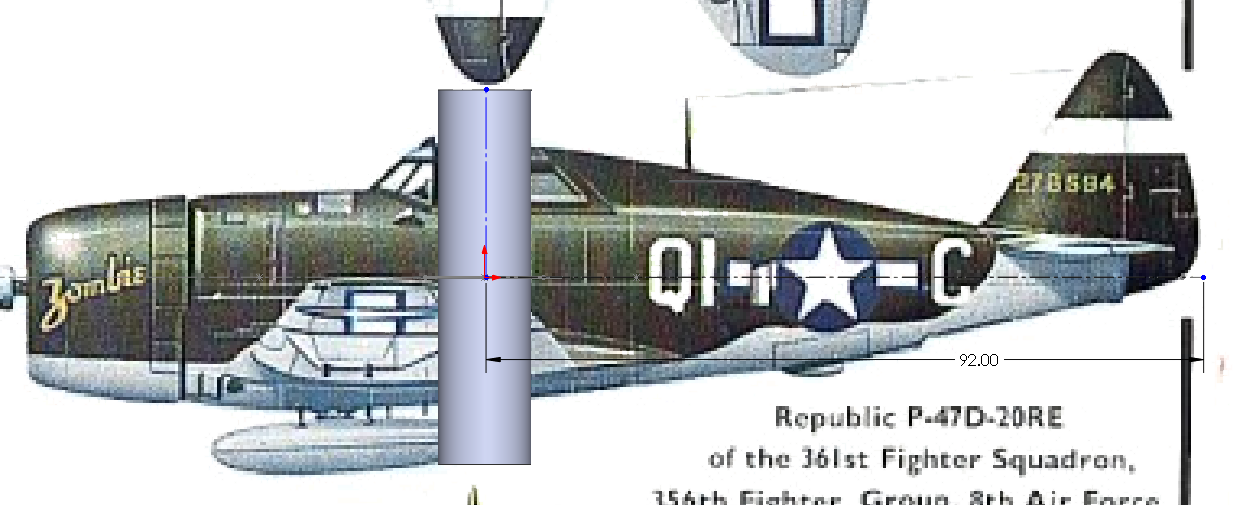 Henry is 35” tall and 10” across at the shoulders. This gave me a reference for the size and scale of the plane. I quickly started in SOLIDWORKS by creating a cylinder “Henry” size. The cylinder allowed the P-47 “three view” I borrowed from the internet to be scaled appropriately. I learned that if I wanted to keep the plane’s features such as the fuselage scaled to Henry’s size the rear fuselage and empennage would be 7 feet long. Obviously this was not going to work.
