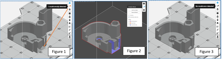 Selecting the icon to repair will show surfaces that are missing. (Figure 2). And selecting Repair all Models will correct the file by adding the missing surfaces to make the part ‘water-tight’. (Figure 3).