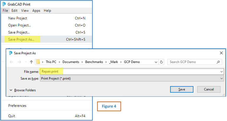 After the part has been repaired, scaled and positioned, use File, Save Project As… and give it a name. In this example, I will name it “Repair.print” (Figure 4).