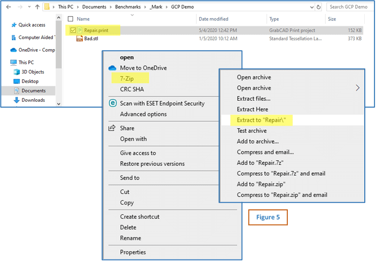 A Repair.print file is created. We can use a Zip applicication to extract the file. Here I selected the file with a right mouse click and choose the 7-Zip application (built into Windows) and extracted it to a folder named “Repair” (Figure 5).