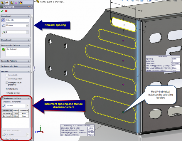 This is new functionality in SOLIDWORKS 2013. Simply set up the pattern like you normally would and then activate the ‘Instances to Vary’ option at the bottom of the property manager of the Pattern command. You can increment the spacing and/or the size of the feature being patterned. For incrementing the feature dimensions, select the dimensions from the graphics window. If you need to make a modification to one of the instances, select one of the instance markers, choose ‘edit instance’ and type in the specific value for that instance. This functionality also works in the circular pattern command.