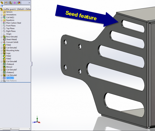 The pattern command in SolidWorks is quite helpful for making quick work of taking a feature, face or body and copying it around in order to create a patterned set of instances. But what if you want to vary the spacing of the instances or the size of the feature being copied? The image below shows the oval-shaped cut on the left side of this muffler guard being patterned down the left side of the guard. Not only is the size changing (length and width are increasing), but the spacing between each instance is changing as well.