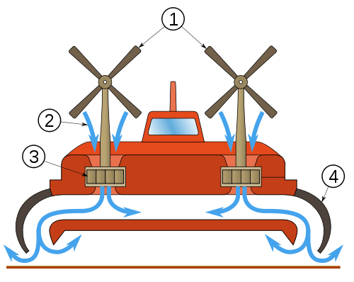 A hovercraft or air-cushion vehicle is a vehicle capable of travelling over variable surfaces, such as land and water. The hovercraft operates by forcing a high pressure of air between the bottom of the craft and the surface below. This high pressure of air lifts the vehicle upward essentially “hovering” above the ground on a cushion of air. The first practical design for hovercraft derived from several coinciding inventions in the 1950s to 1960s. They are now used throughout the world as specialized vehicles for transport and other applications.